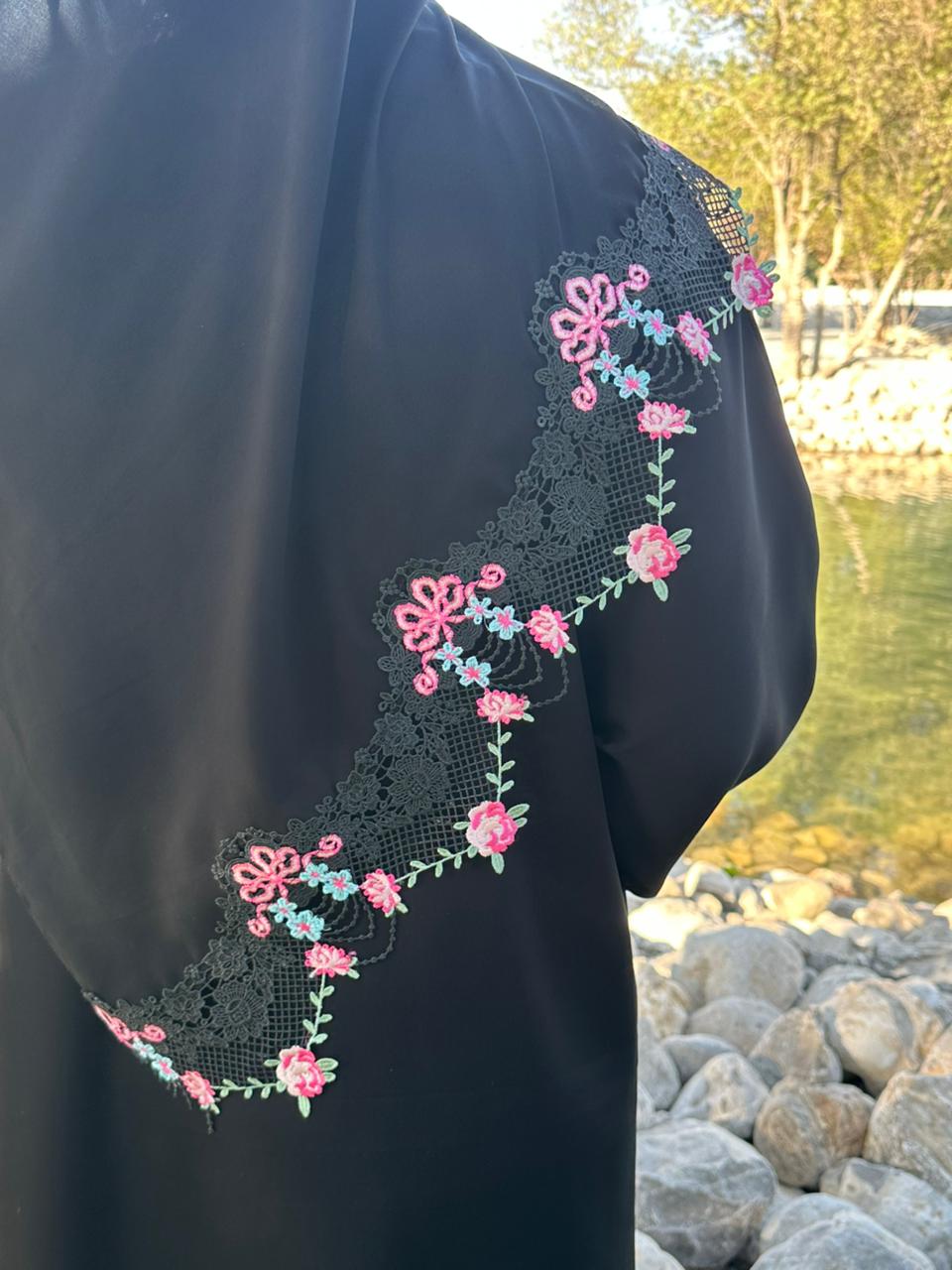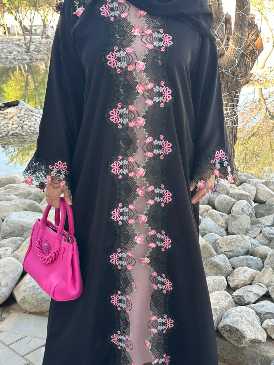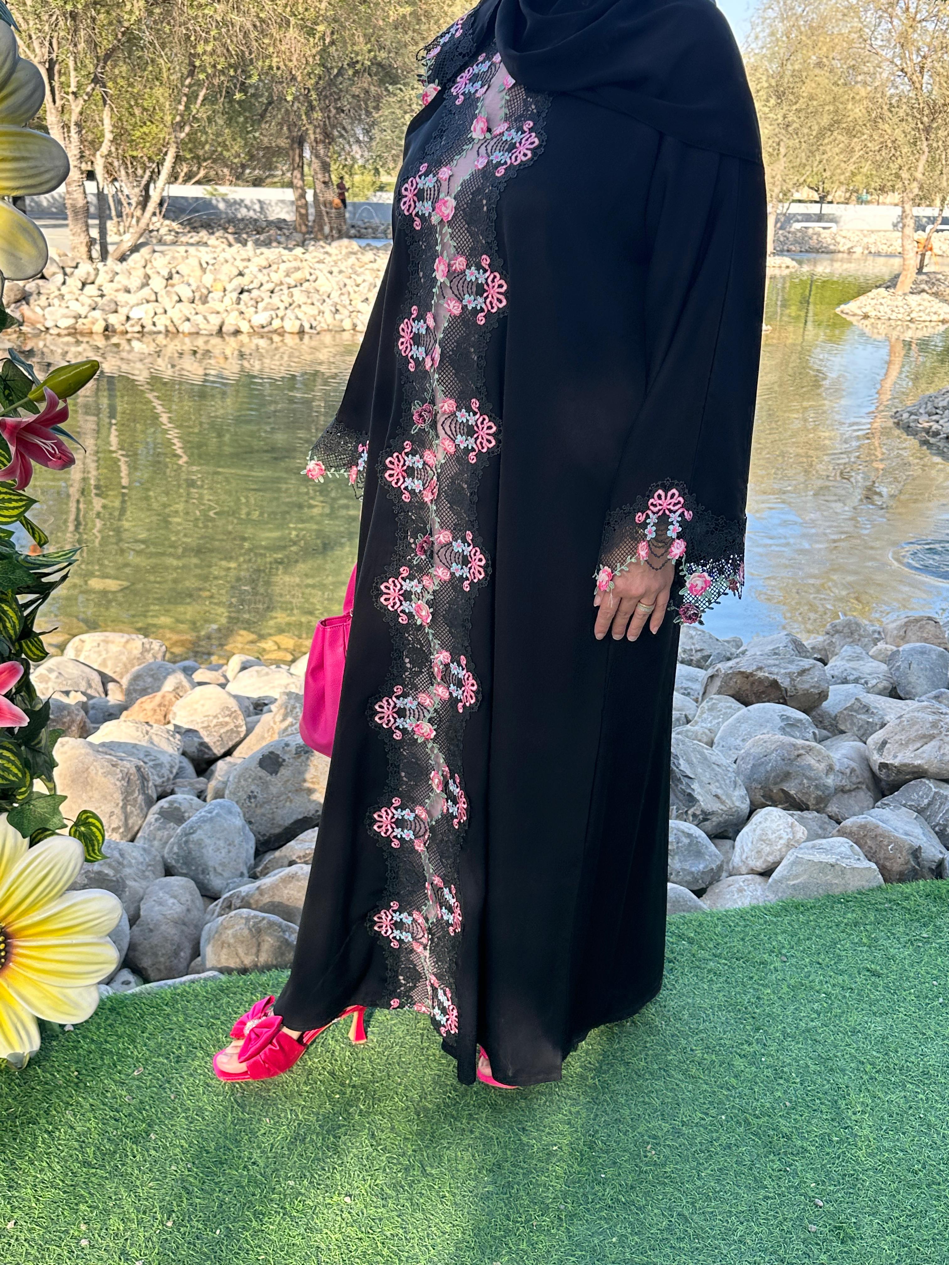 Abaya made from nada fabric with luxurious pink lace