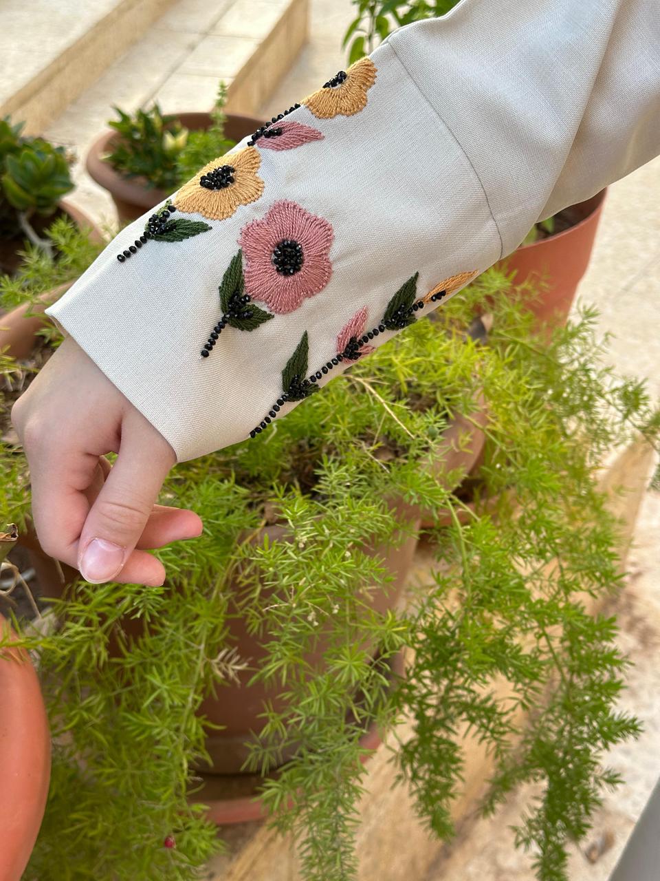 Abaya made from linen fabric with floral embroidery on the sleeves of the abaya