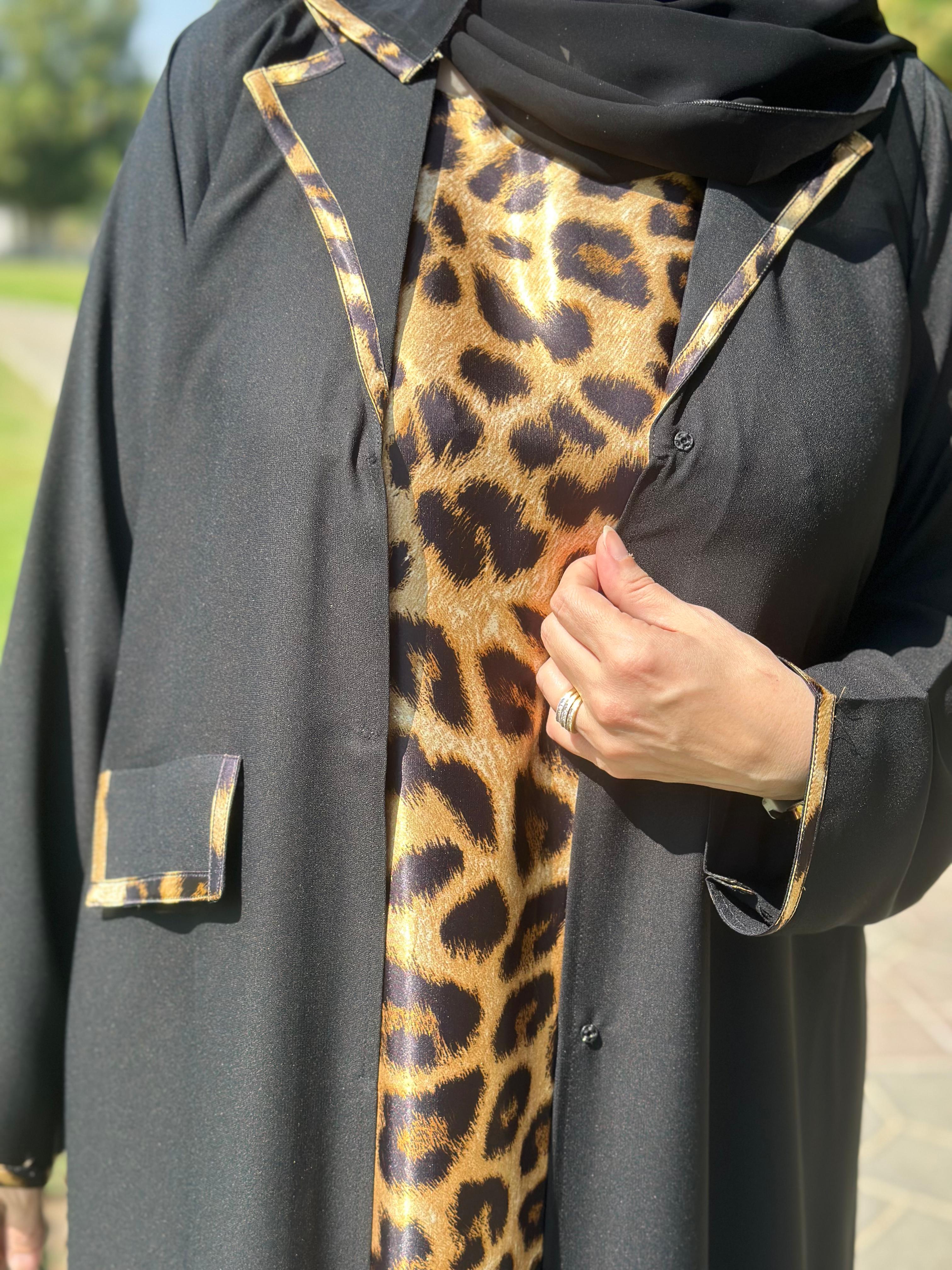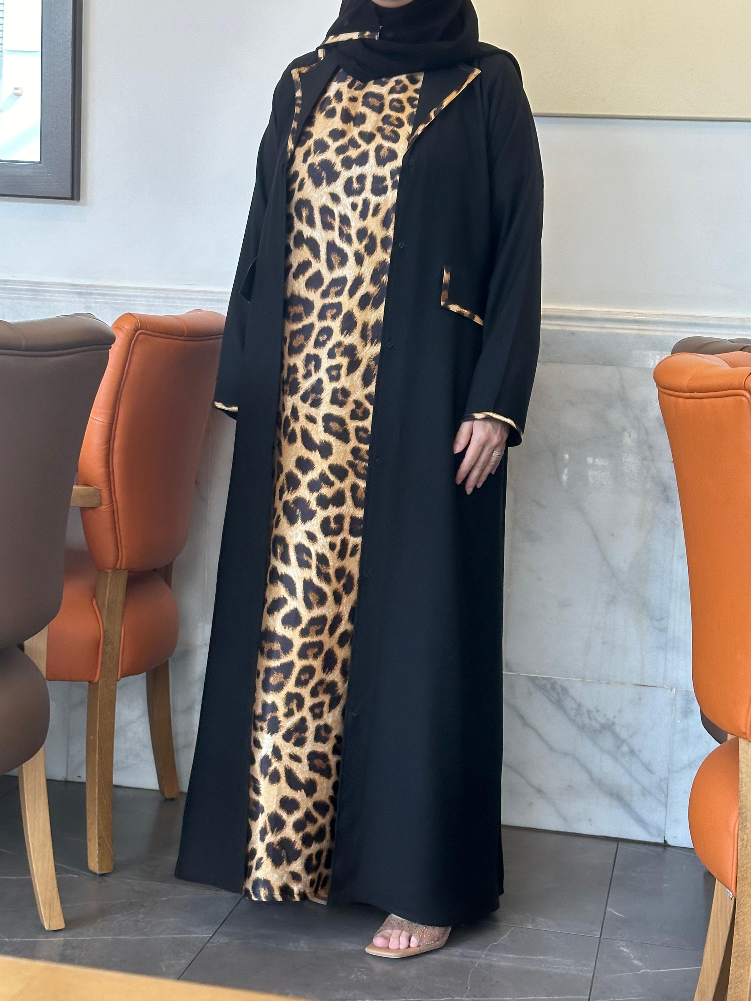 Blazer-cut abaya with pockets and a dress in cheetah print