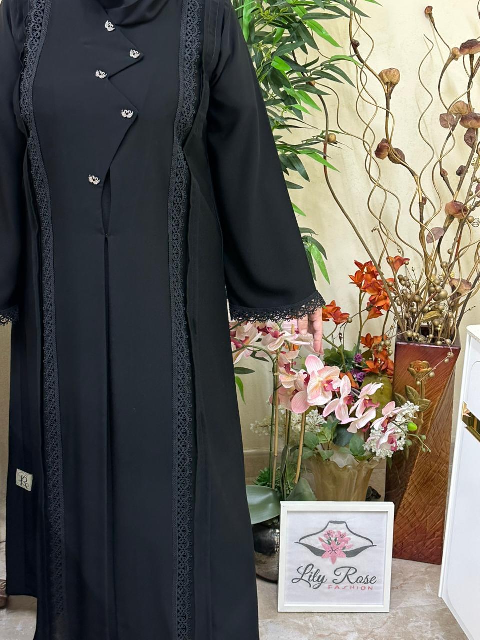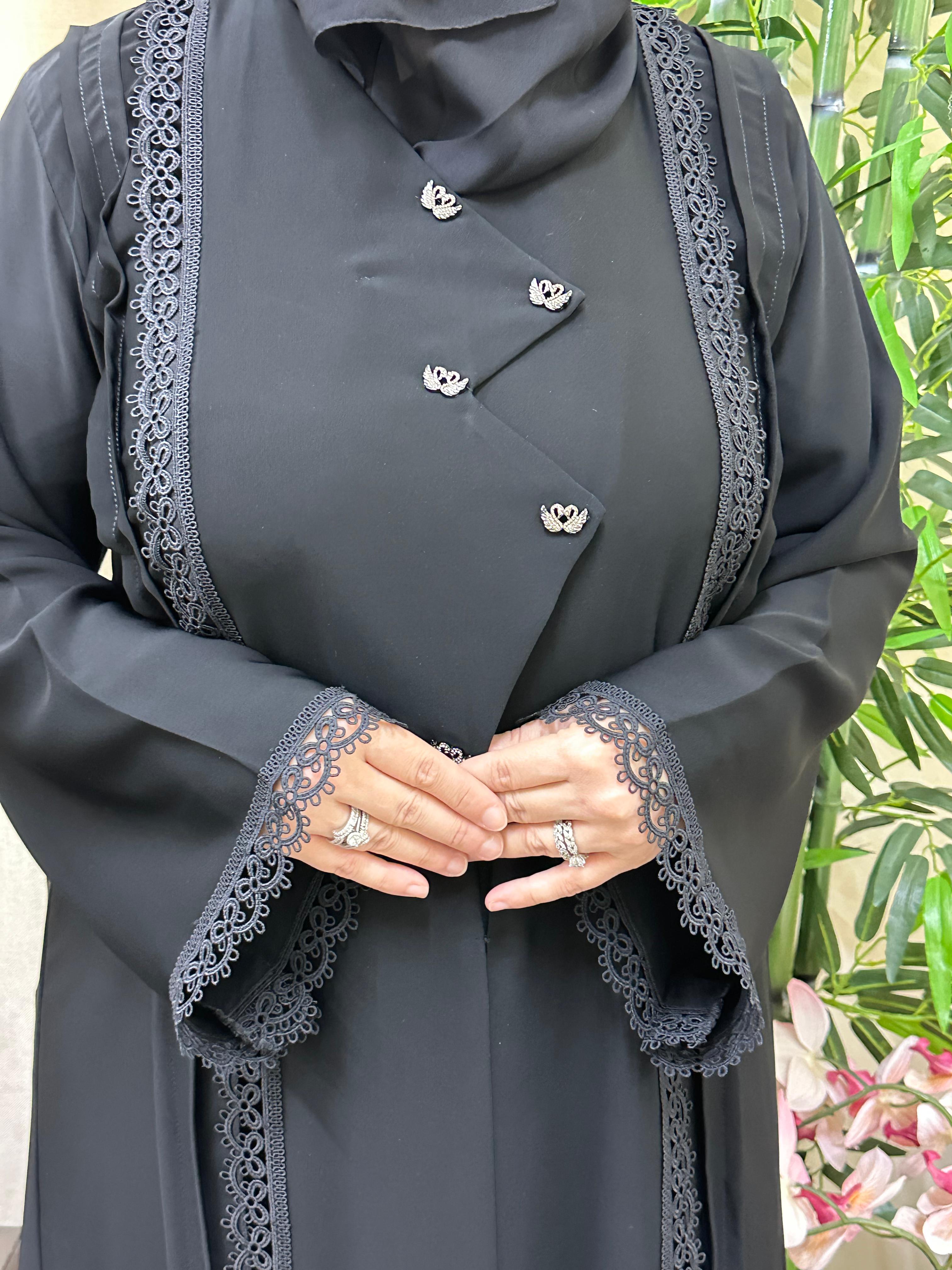 Practical black abaya with a distinctive cut and simple lace on the abaya