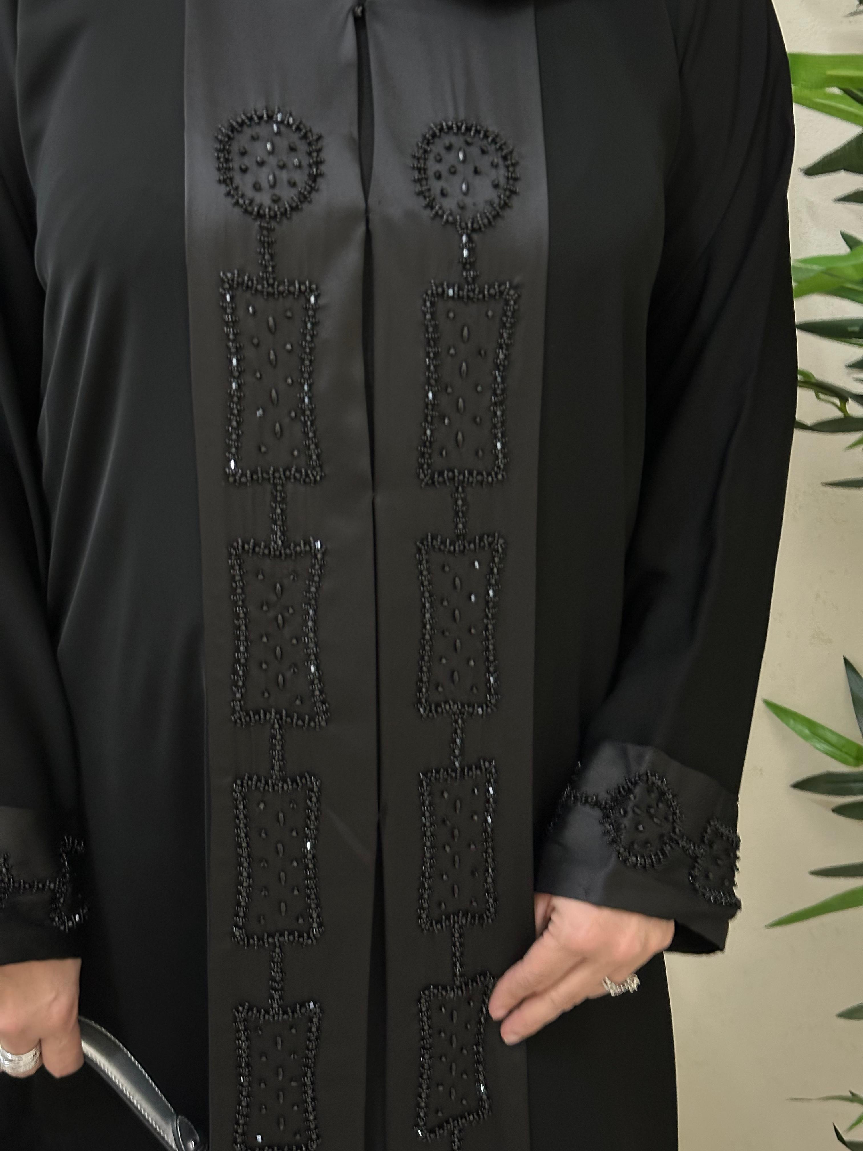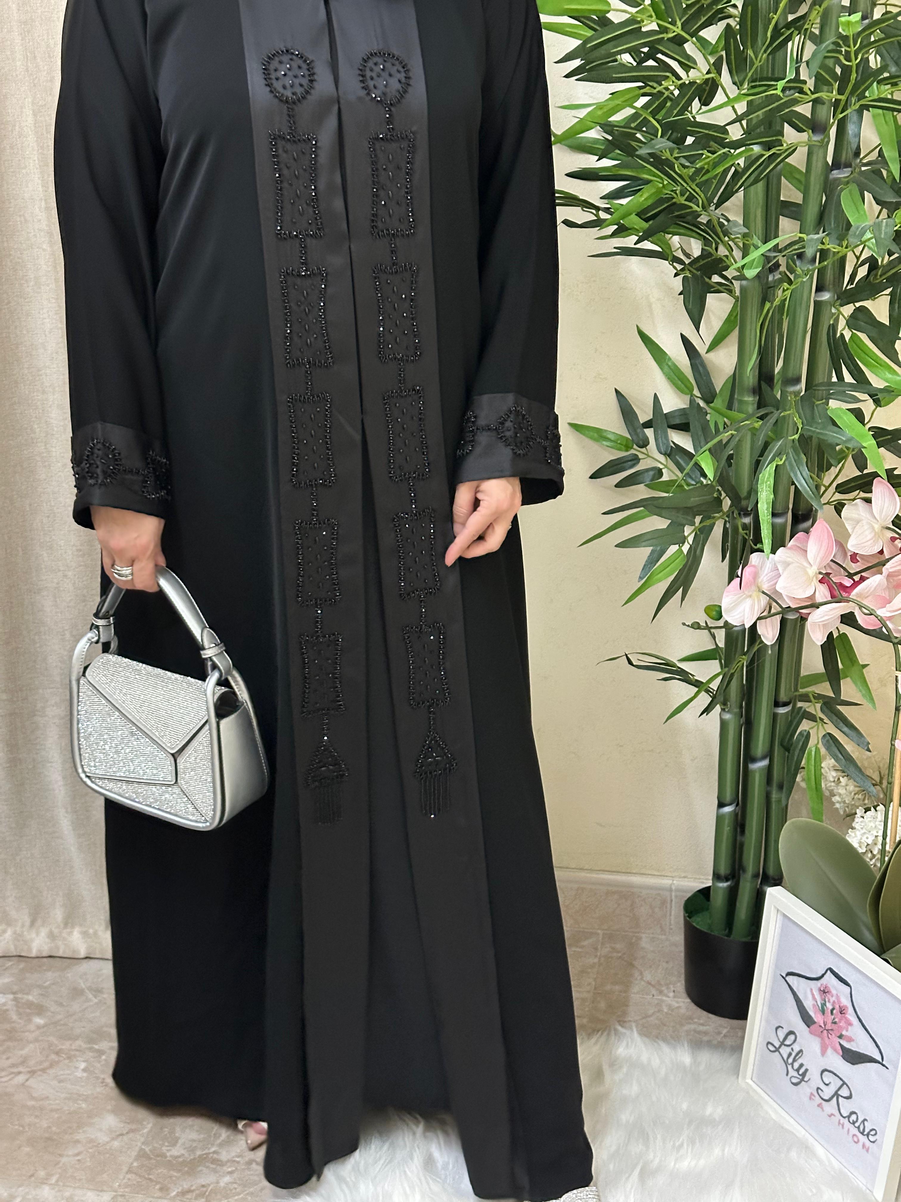 Abaya made from nada fabric with satin on the front and sleeves of the abaya, fully beaded