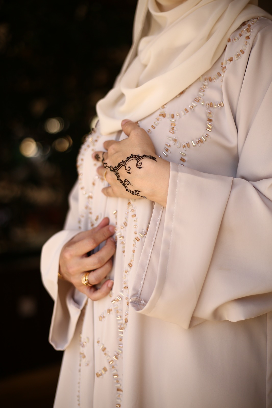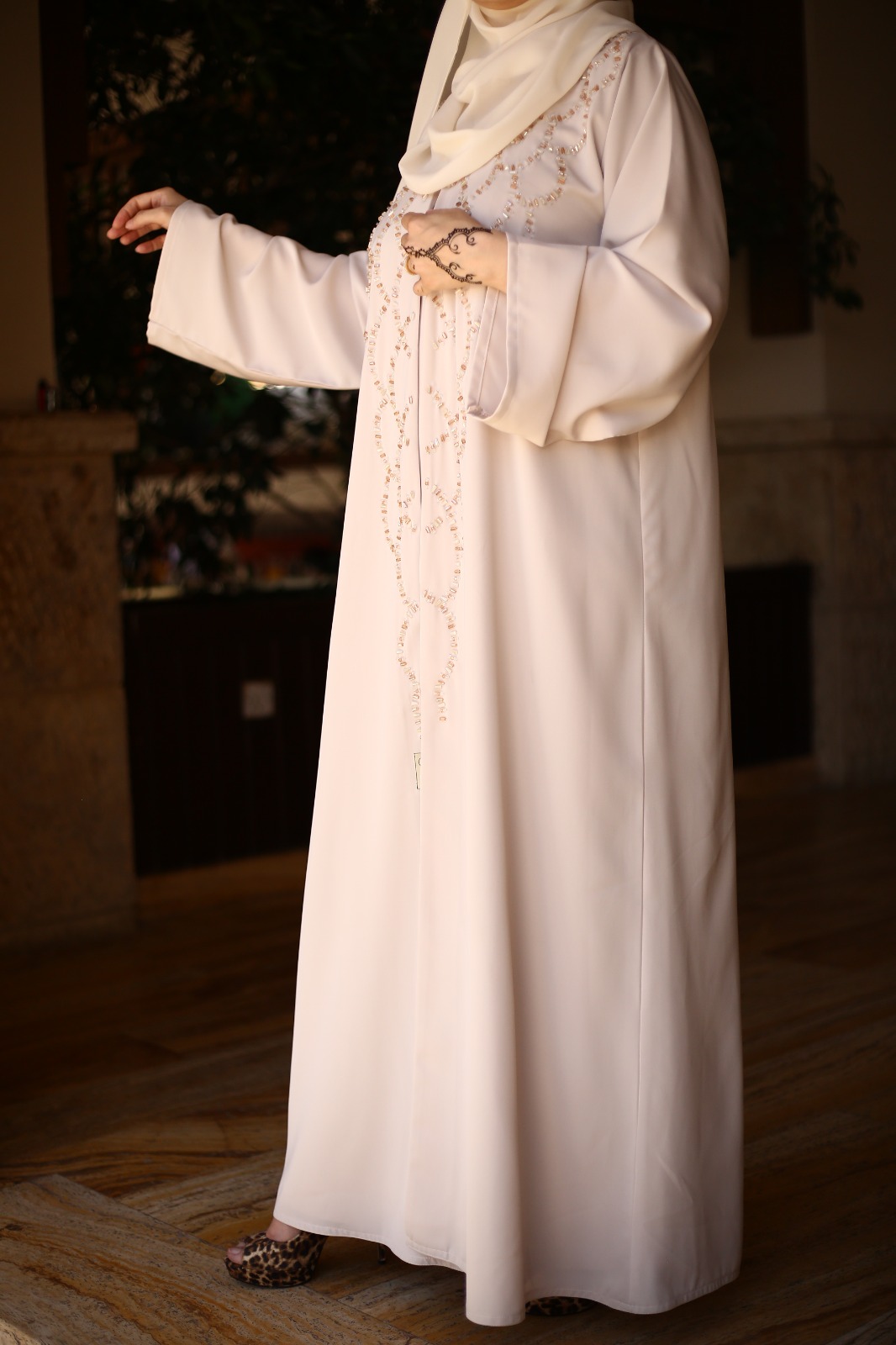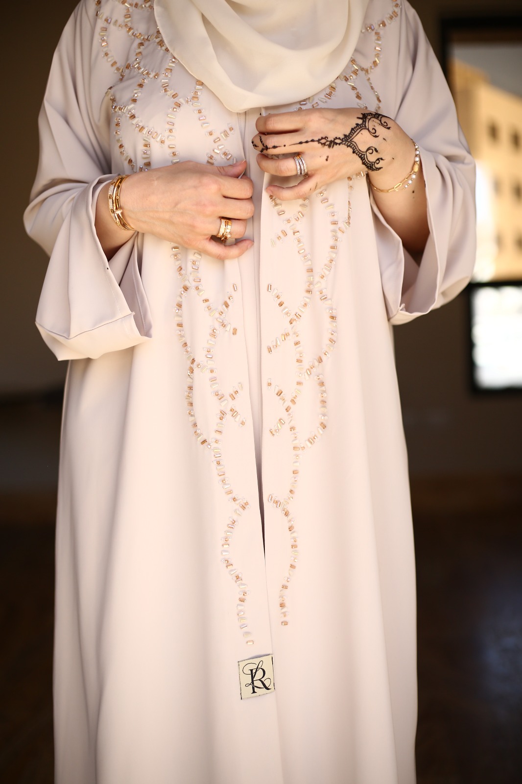 Abaya with a beige dress made from nada fabric and hand beadwork on the abaya