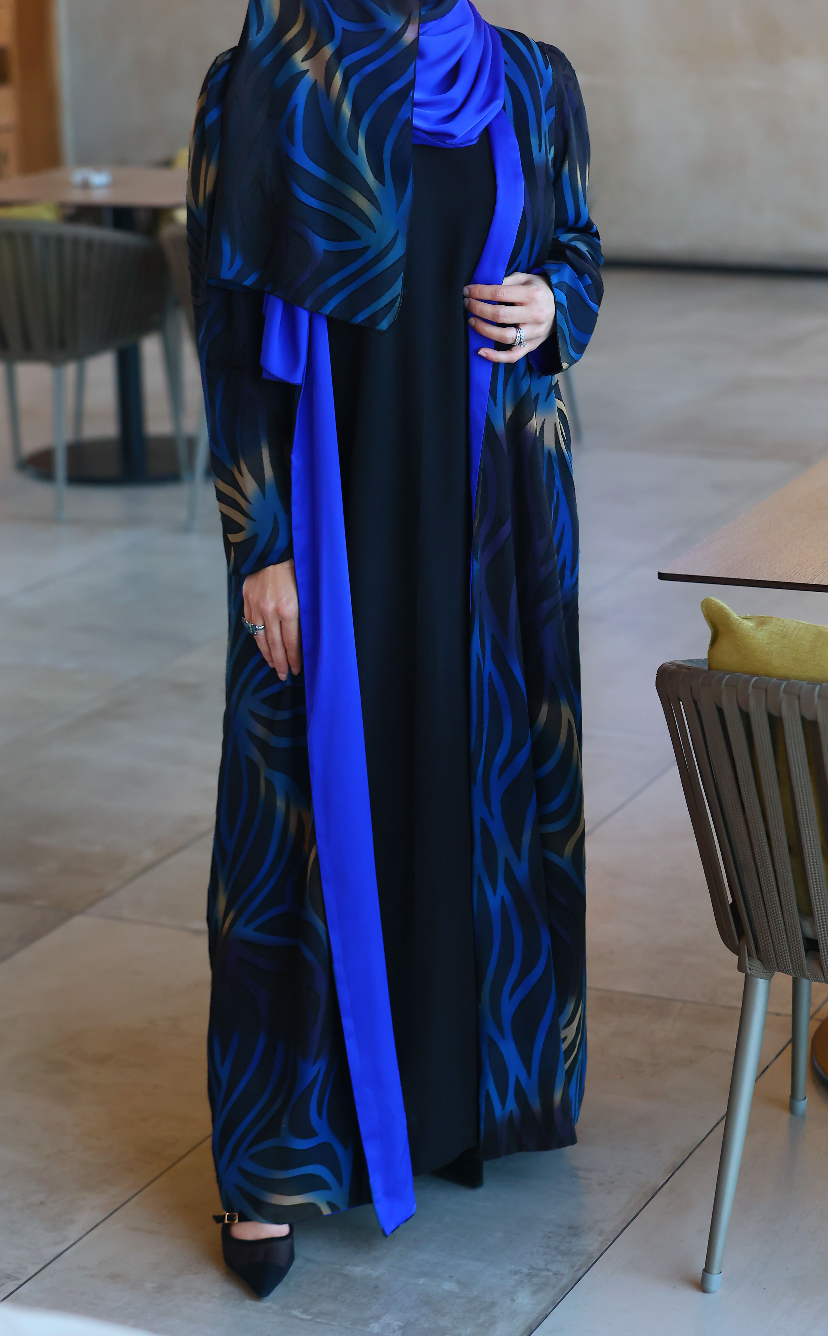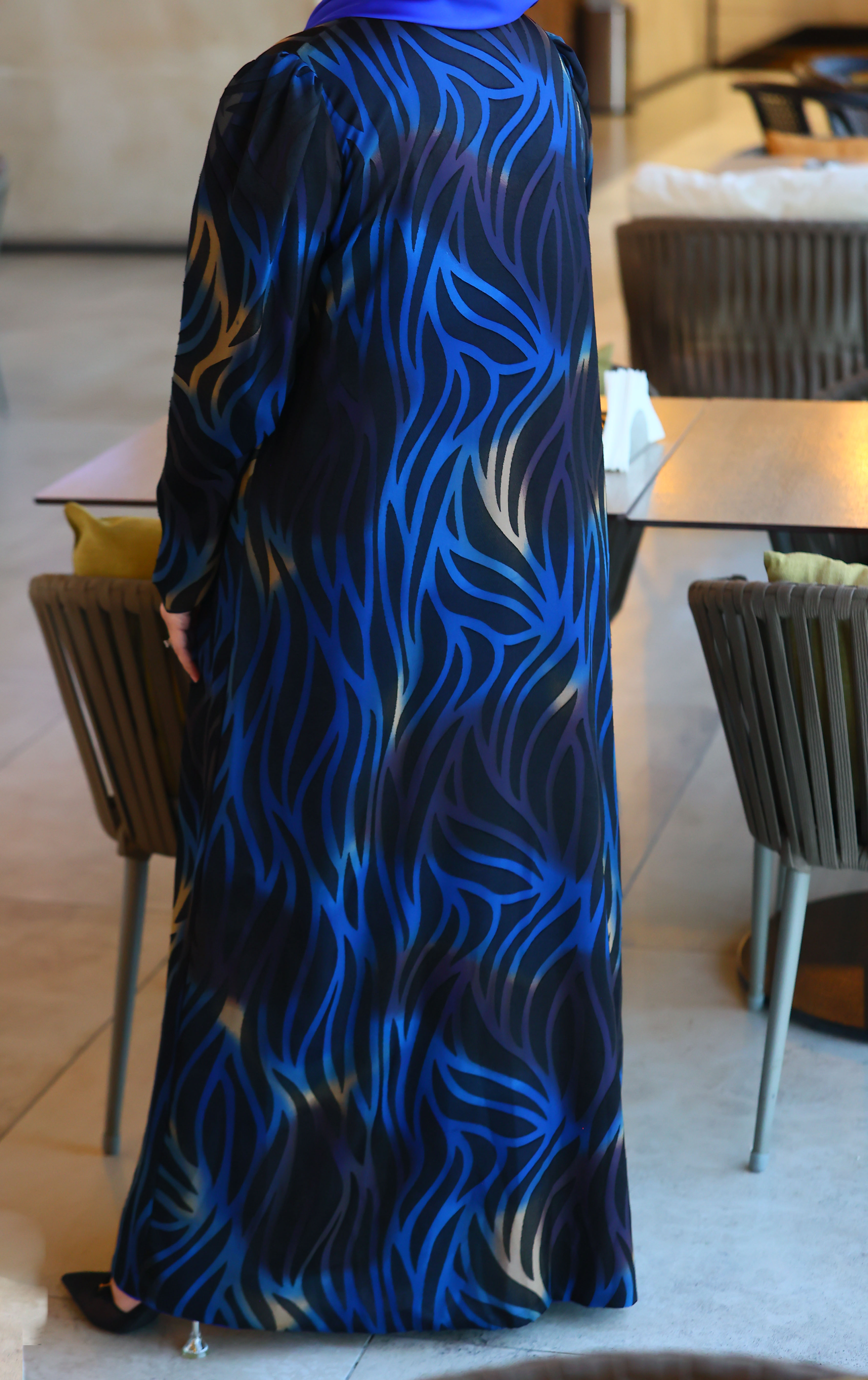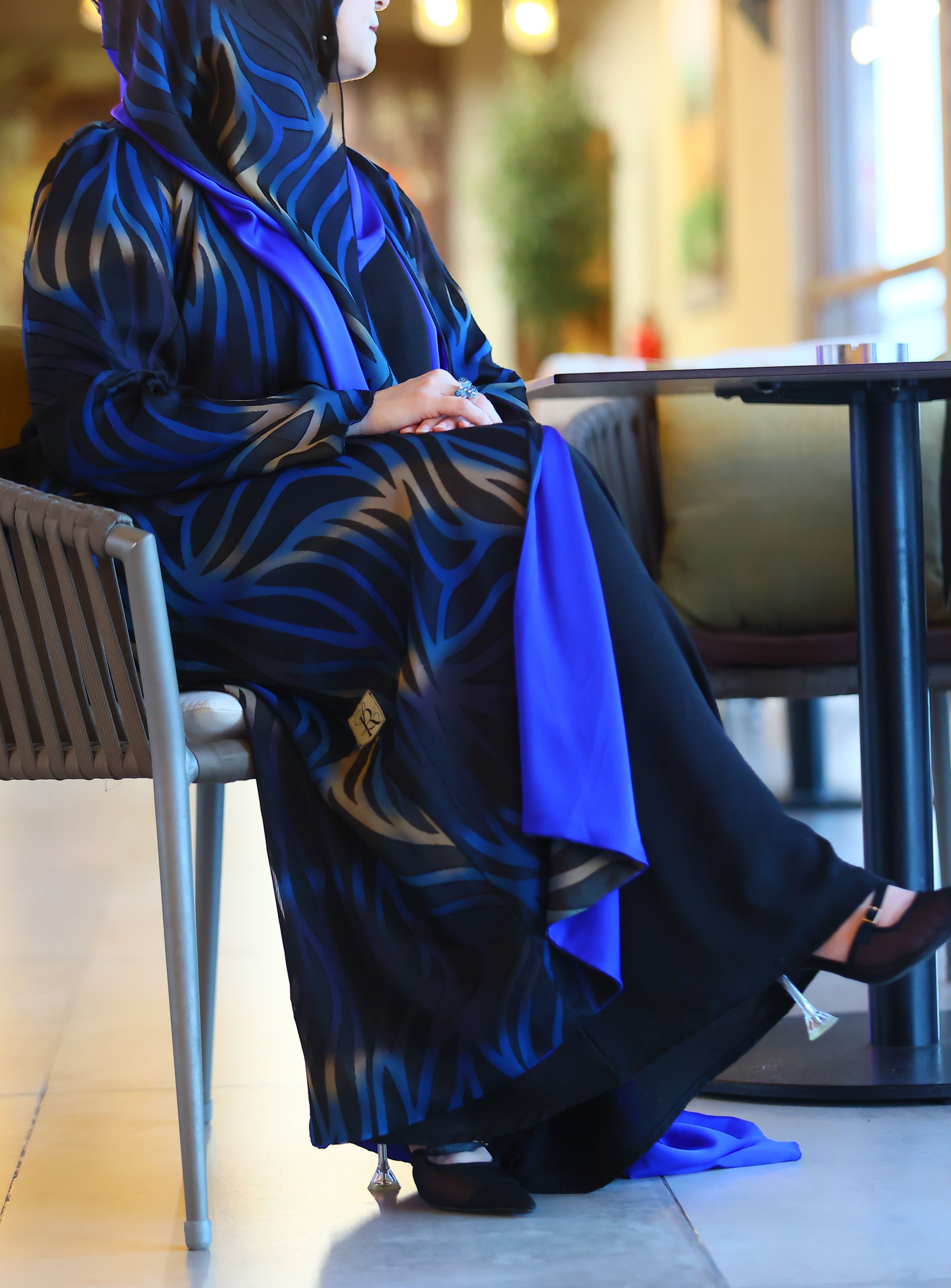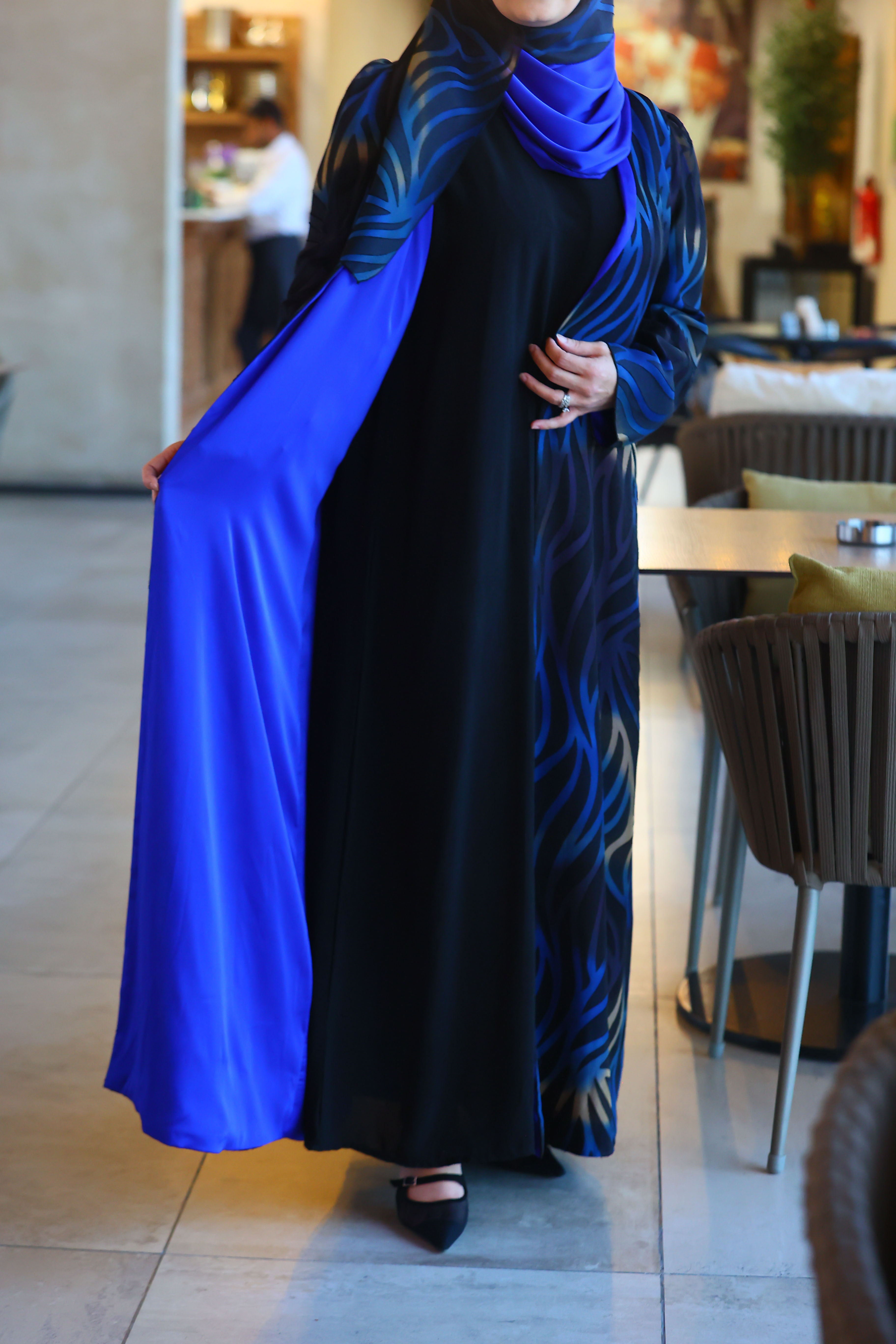 Double-face blue abaya, striped chiffon on one side and silk on the other